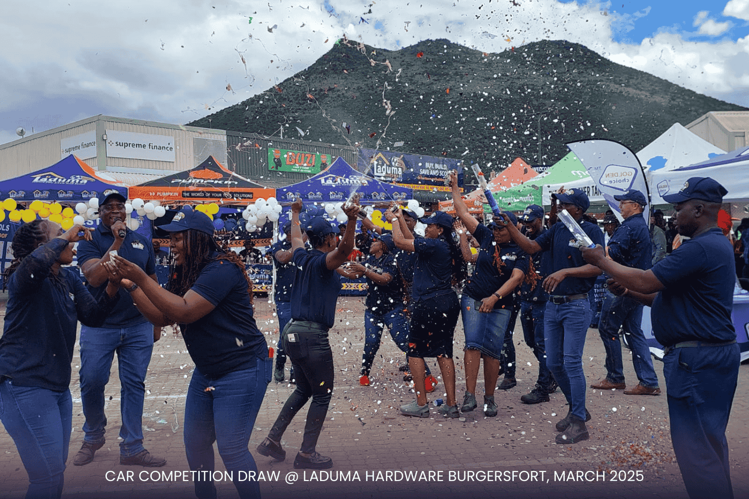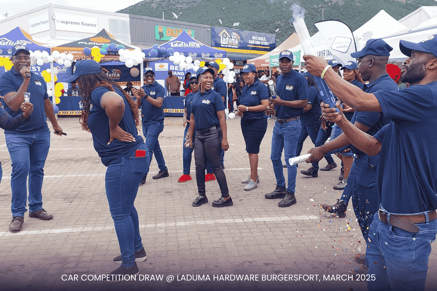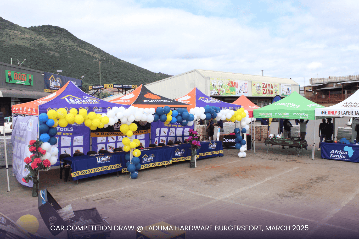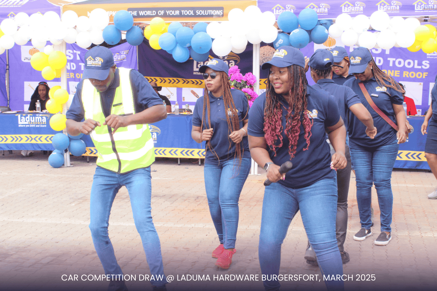 With a prime setup right at the doorstep of our competitor, Build It, the event was a visual spectacle! Our incredible suppliers—Tile Magic, Al Shaik, Lin Tank, Africa Tank, Corobricks, Matus, PPC Cement, and Mamba Cement and others—showed up in style, displaying their products and promotional items to keep the audience engaged. The Laduma Team worked tirelessly to create an exciting, well-organized arena, ensuring top-tier entertainment for our valued customers.