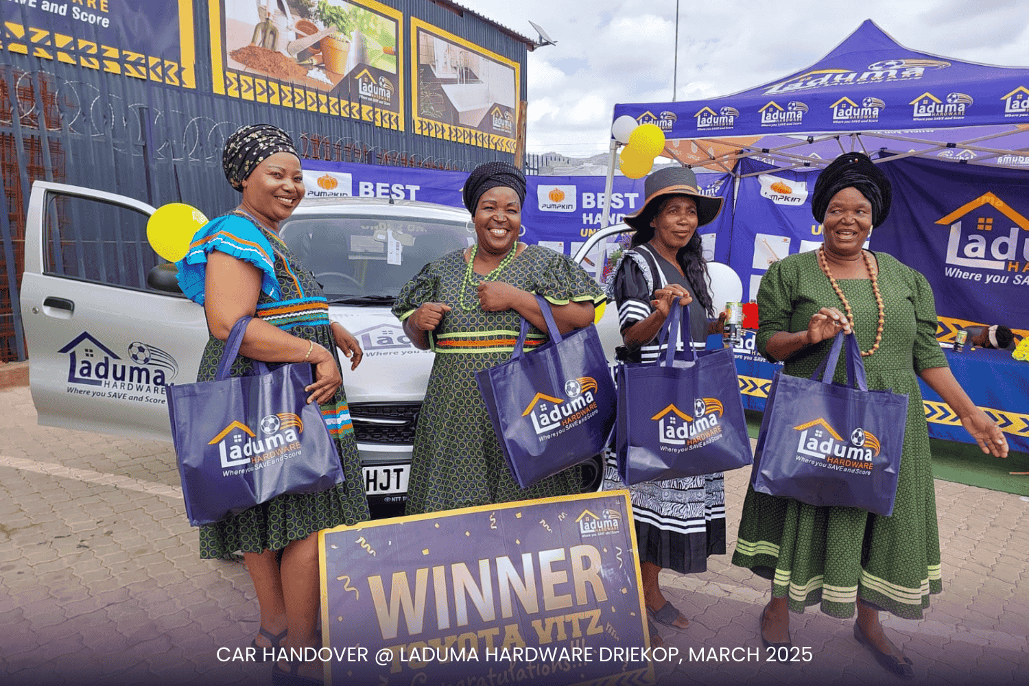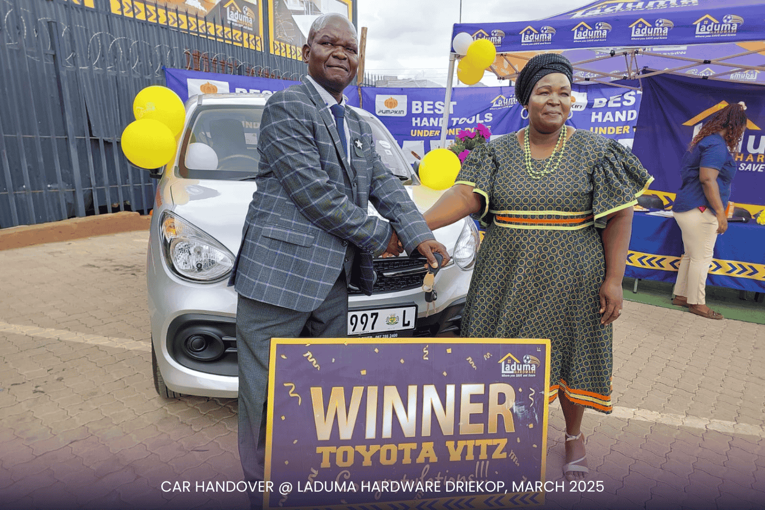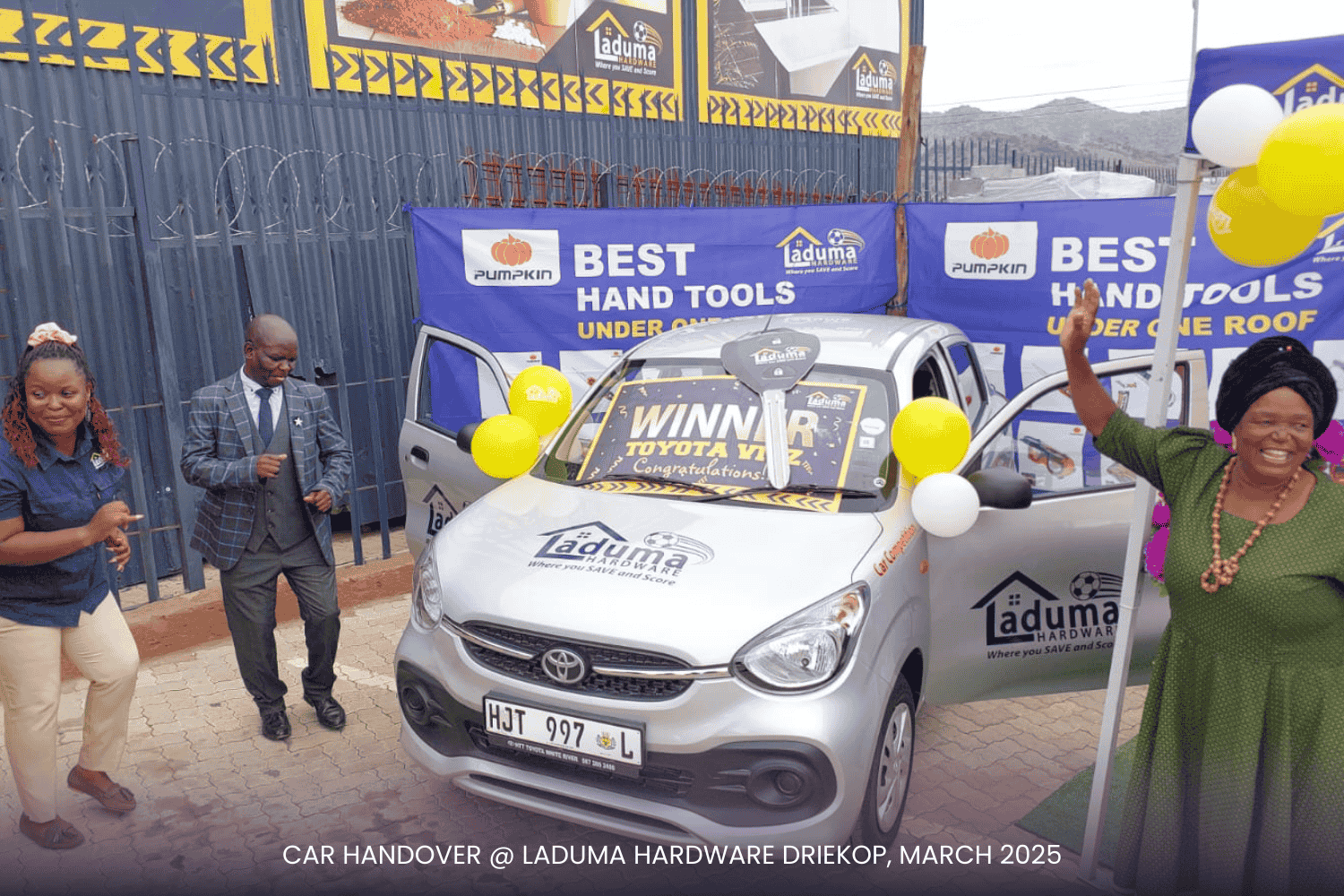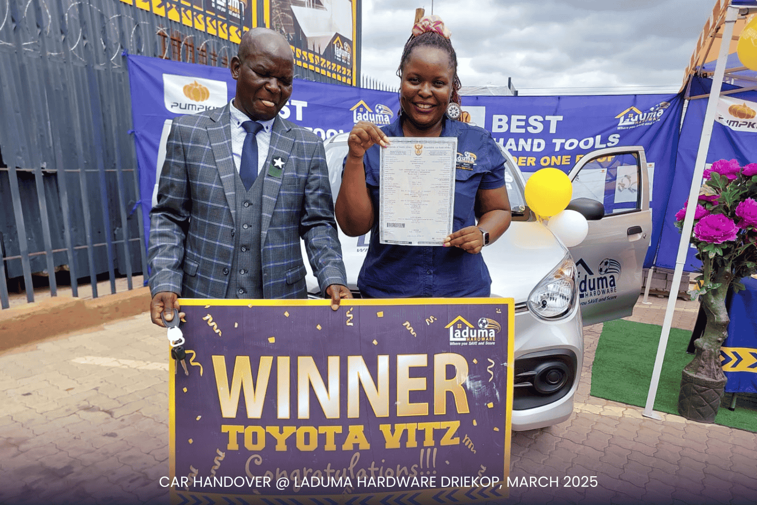 An overly excited Lucas Piet Mphethi could not contain his joy as the official day to receive his brand-new Toyota Vitz, courtesy of Laduma Hardware Driekop, finally arrived on March 27, 2025. Matching his excitement was the equally jubilant Driekop Laduma Hardware staff, who made sure the event was lively and celebratory, expressing their joy that one of their own had won the competition.