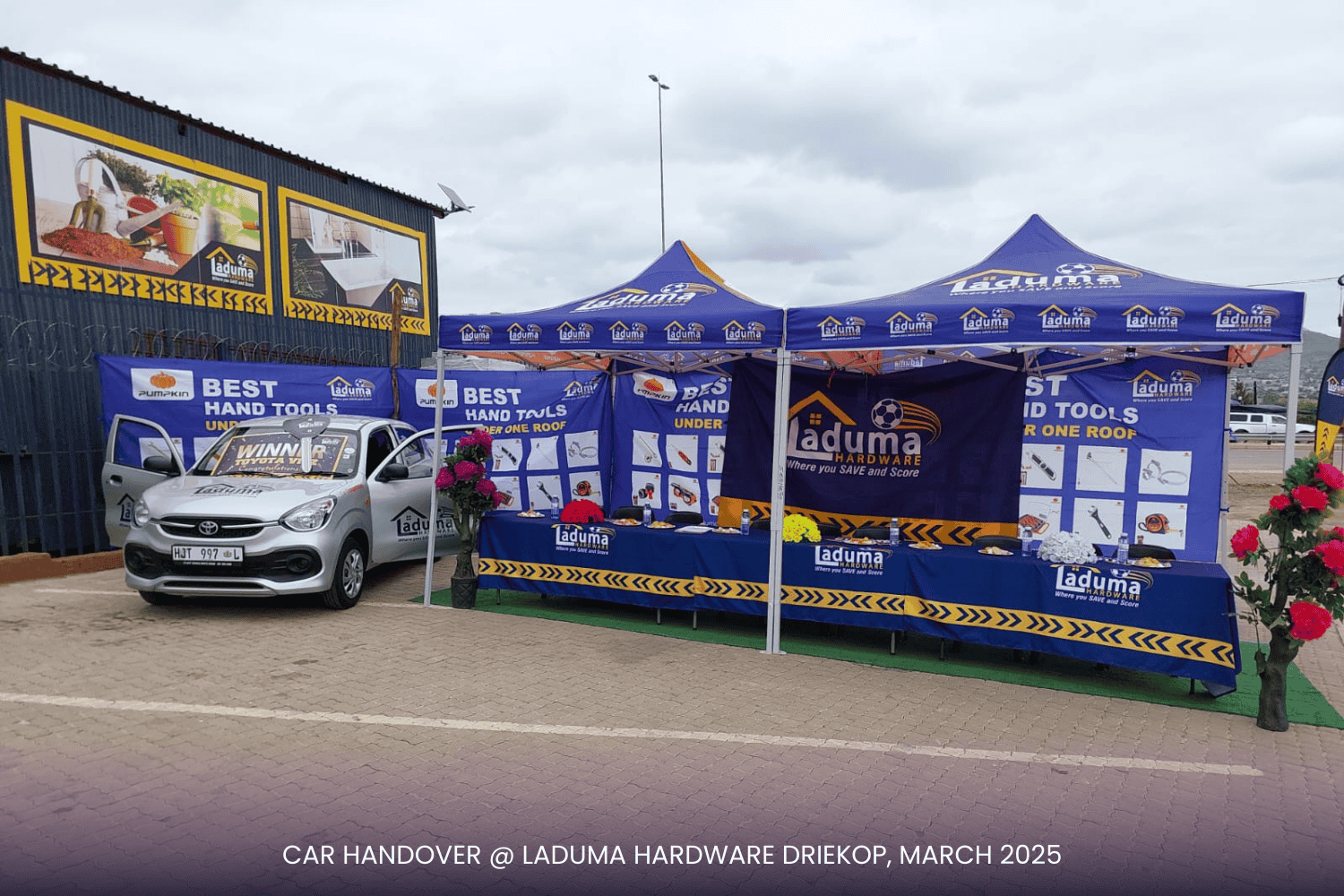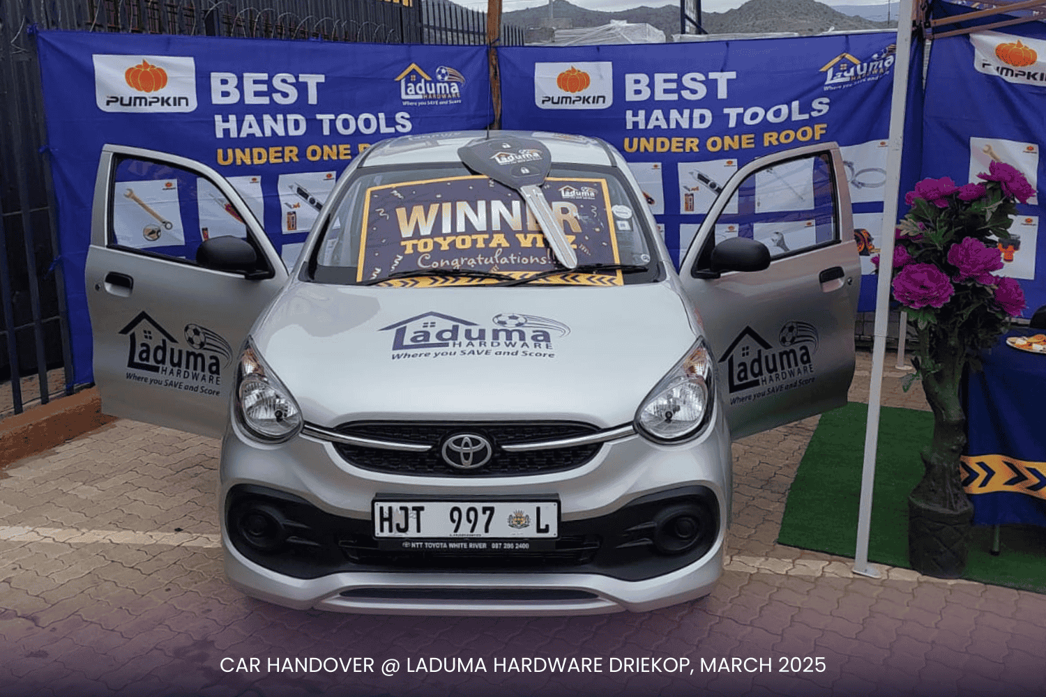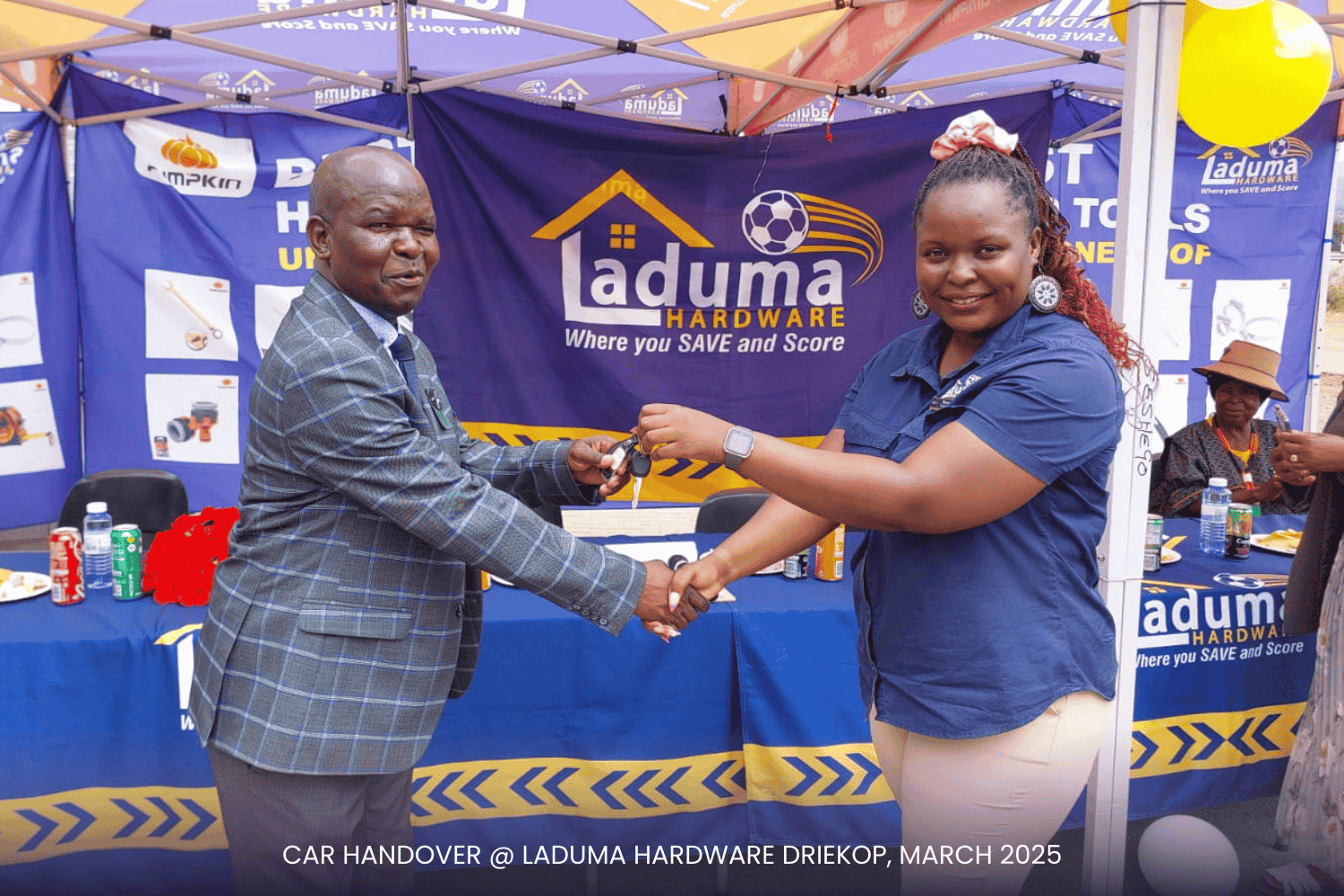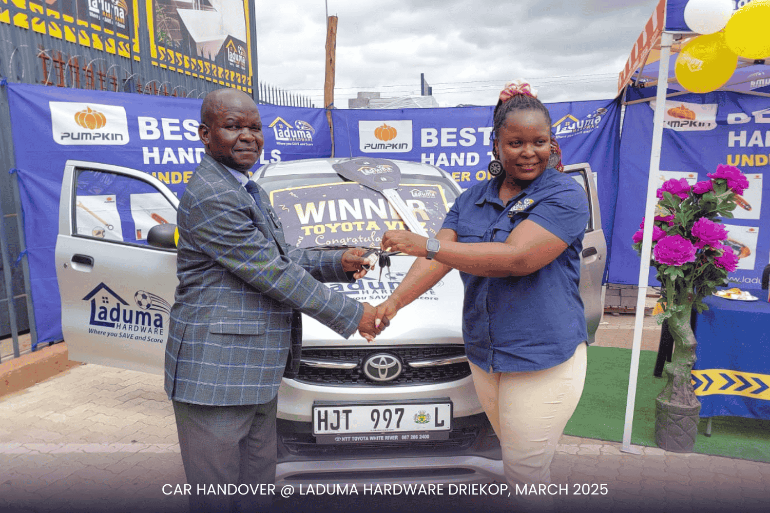 An overly excited Lucas Piet Mphethi could not contain his joy as the official day to receive his brand-new Toyota Vitz, courtesy of Laduma Hardware Driekop, finally arrived on March 27, 2025. Matching his excitement was the equally jubilant Driekop Laduma Hardware staff, who made sure the event was lively and celebratory, expressing their joy that one of their own had won the competition.