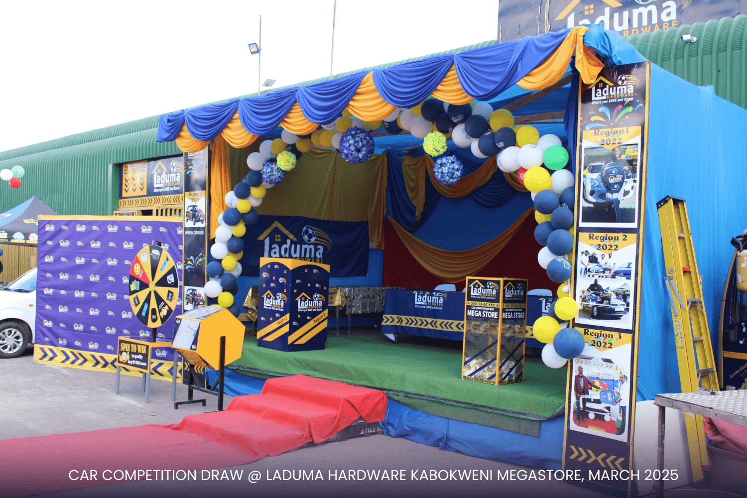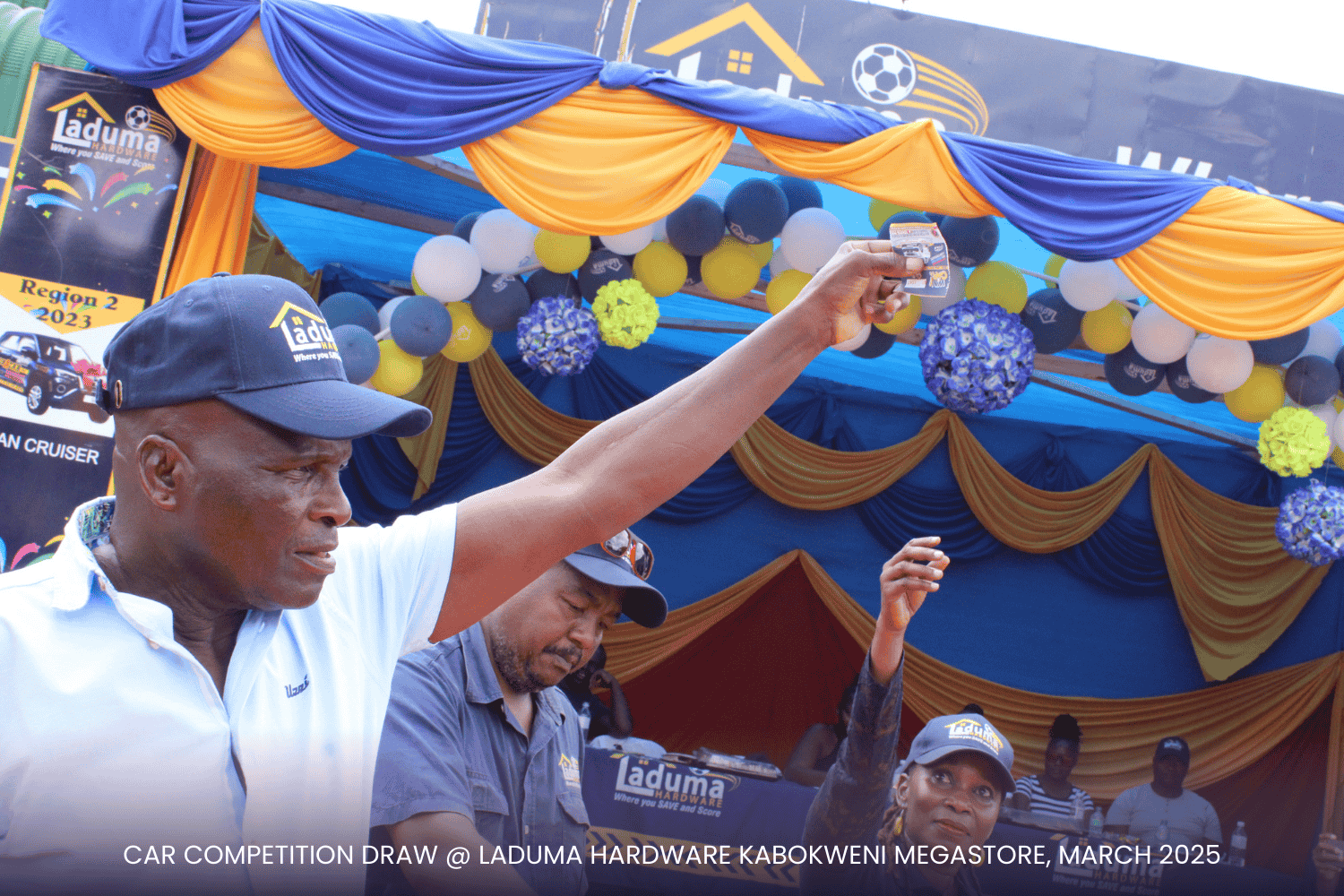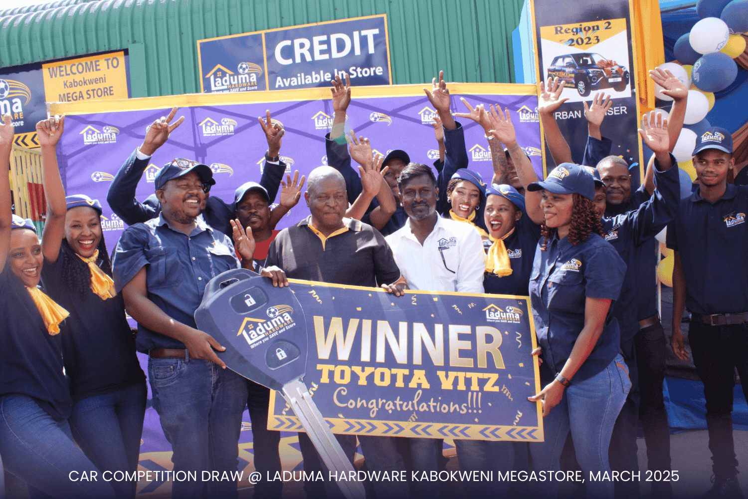 The staff, the suppliers, the audience all erupted in excitement as Dumisani, a well-known and loyal customer of Kabokweni Mega Store. Dumisani had just won the brand-new Toyota Vitz! And for the first time, the grand prize winner was present at the draw! What an electric moment—one for the history books in the community of Kabokweni and Laduma Hardware’s chronicles!