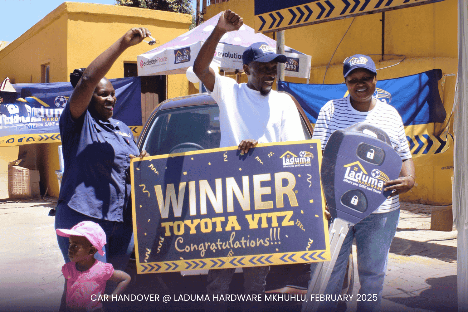 Keeping our brand promise remains a core pillar of our business strategy. In our recently concluded car competition at Mkhuhlu Laduma Hardware, Bethuel Sebila was selected as the lucky winner from thousands of competition entries—publicly, freely, and fairly—on 8th February 2025.