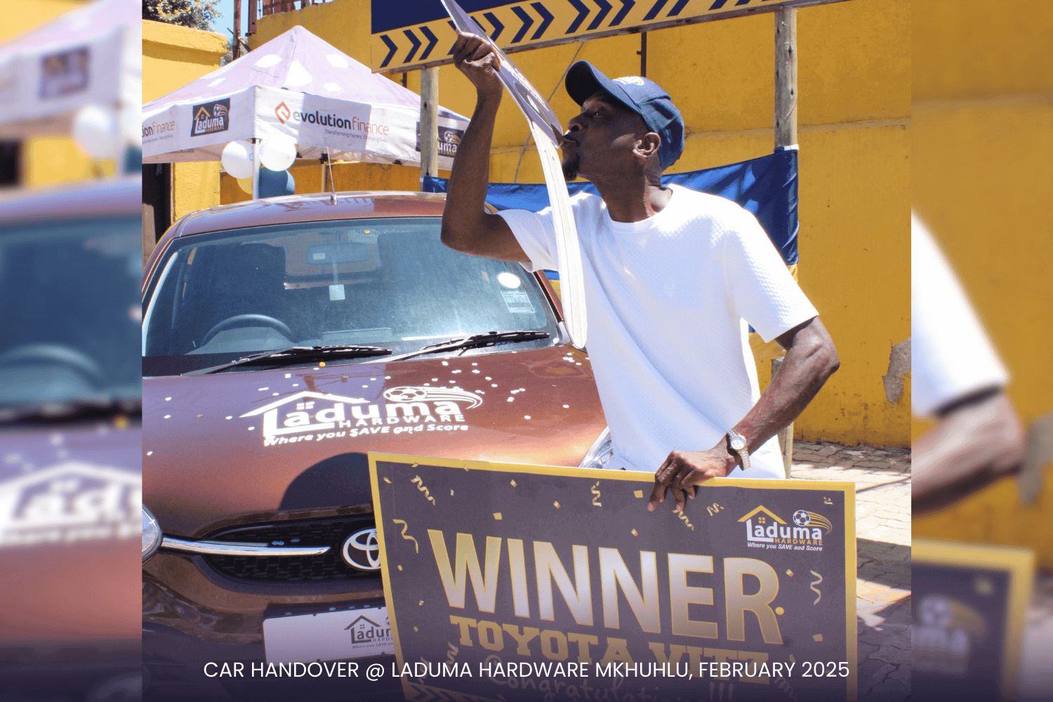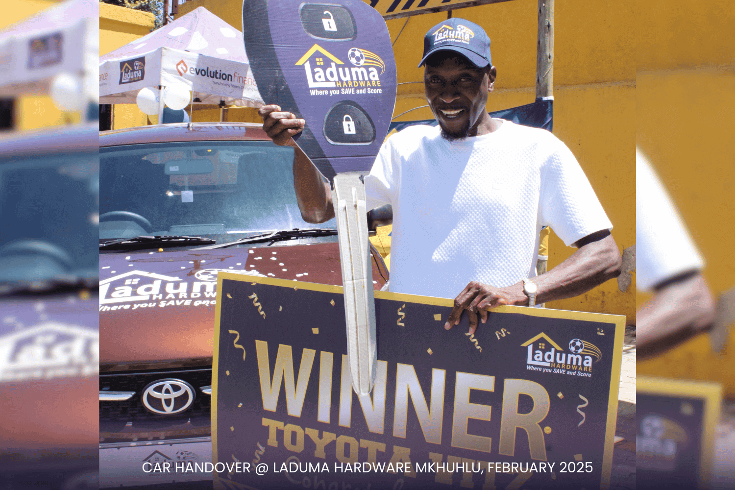 Congratulations, Mr. Sebila! We wish you many happy kilometers with your brand-new car—courtesy of Mkhuhlu Laduma Hardware!