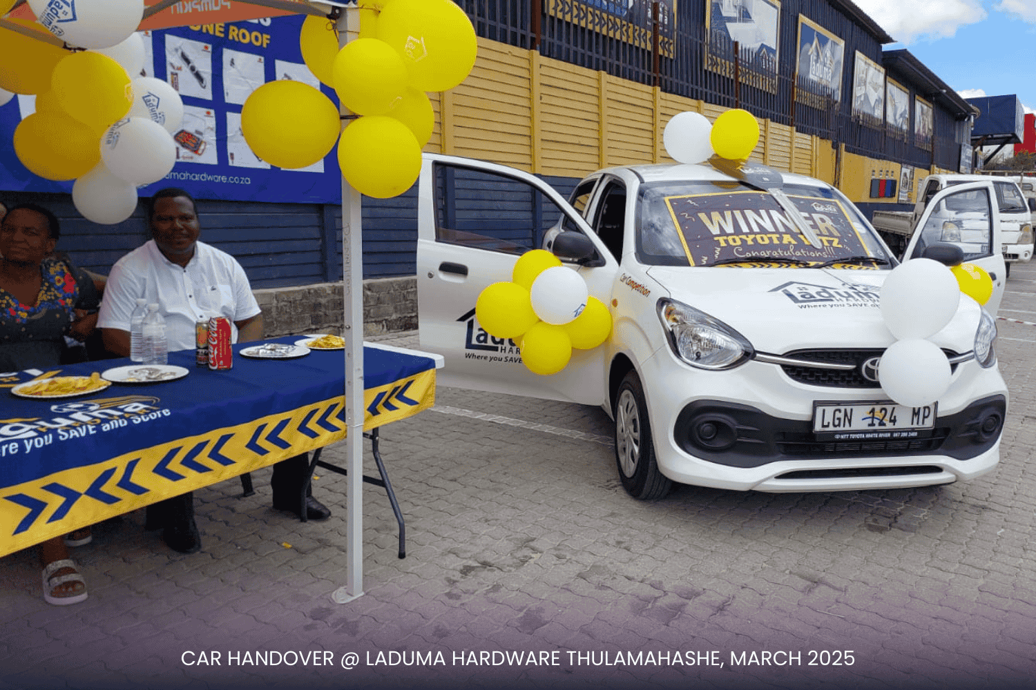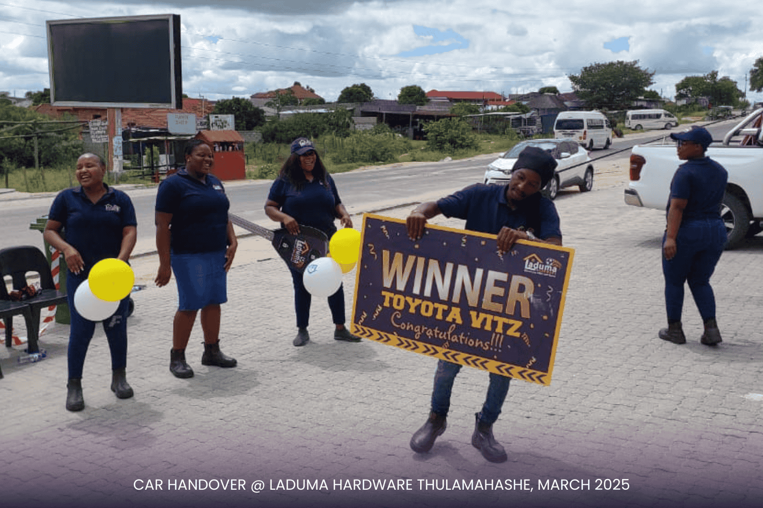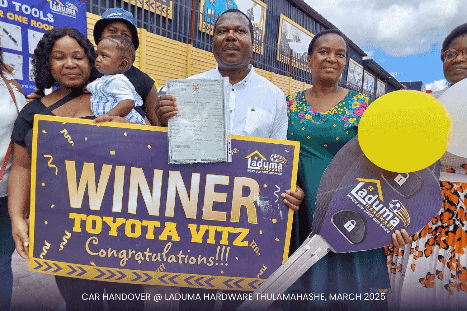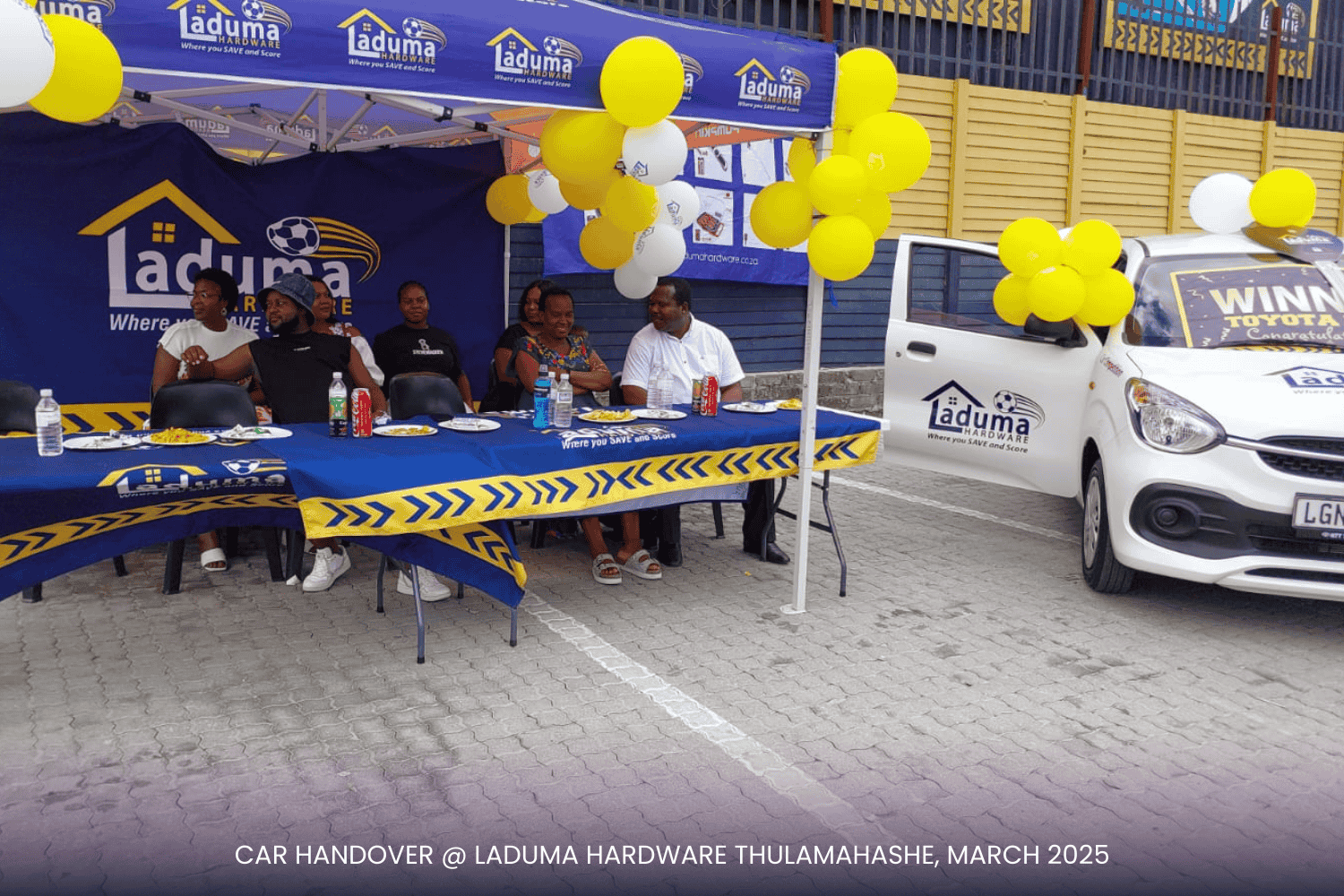 The event, though short and sweet, was packed with joy and appreciation. It began with a prayer, followed by speeches from management and the official signing of agreements. Mr. Nxumalo, accompanied by his family, friends, and neighbours, was overwhelmed with gratitude. He expressed his excitement, calling it a “Grand Win”- not only did he walk away with a brand-new car, but he had no outstanding debt to pay. Even more rewarding was the fact that he won while continuing his building project, making it a double victory! Mr. Nxumalo pledged to remain a proud ambassador of Laduma Hardware.