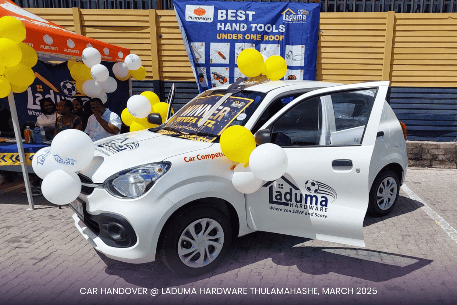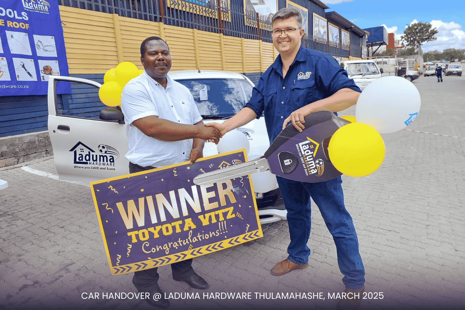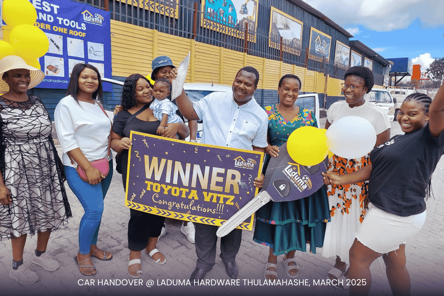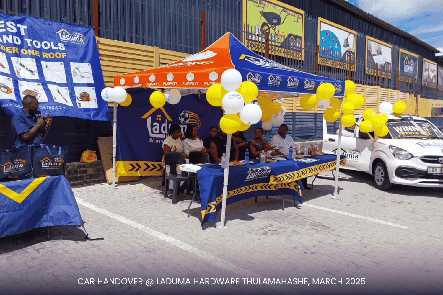 The event, though short and sweet, was packed with joy and appreciation. It began with a prayer, followed by speeches from management and the official signing of agreements. Mr. Nxumalo, accompanied by his family, friends, and neighbours, was overwhelmed with gratitude. He expressed his excitement, calling it a “Grand Win”- not only did he walk away with a brand-new car, but he had no outstanding debt to pay. Even more rewarding was the fact that he won while continuing his building project, making it a double victory! Mr. Nxumalo pledged to remain a proud ambassador of Laduma Hardware.