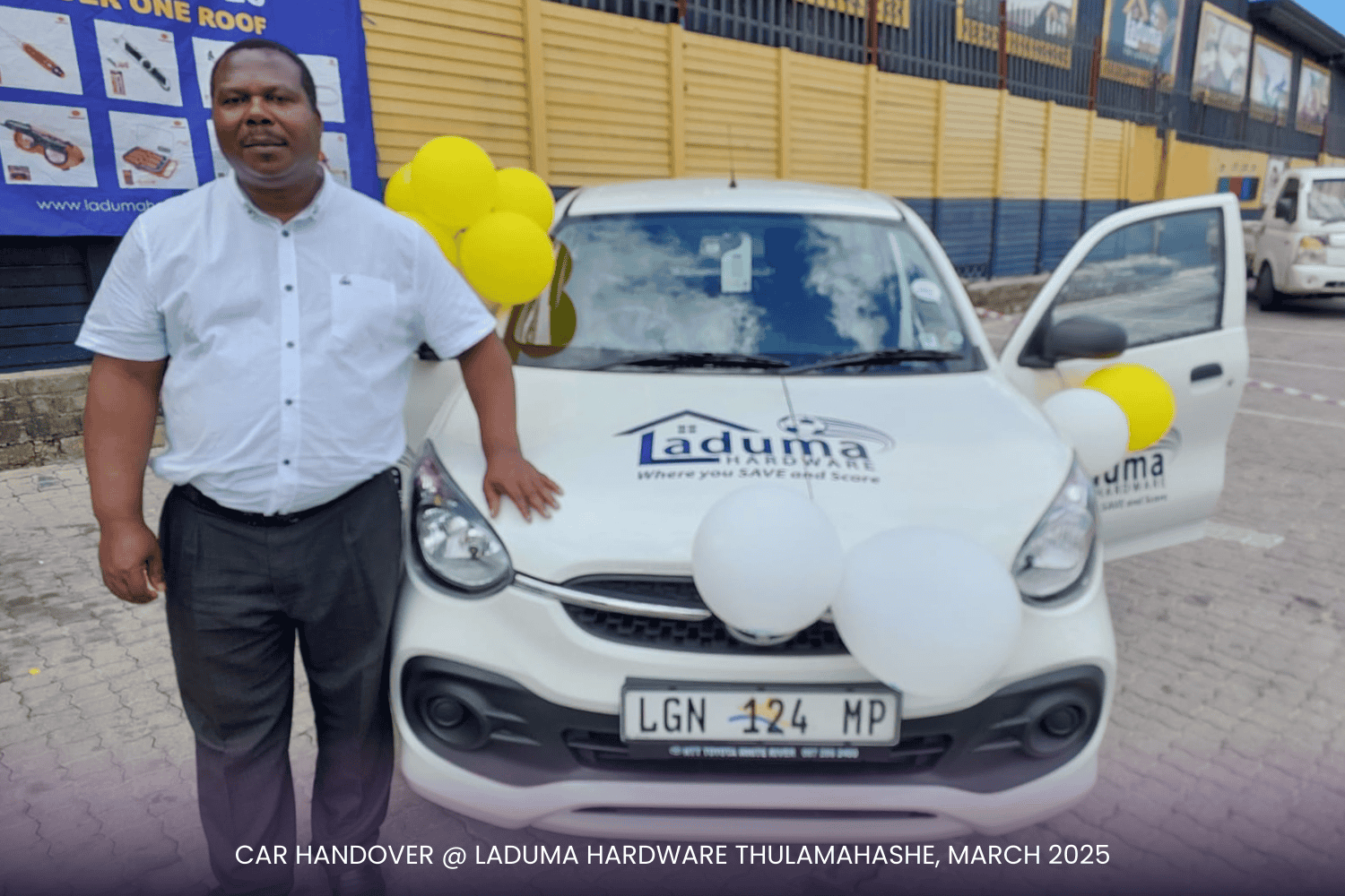 March 13, 2025, will forever be a memorable day for the Nxumalo family of Dumphries Village, as Thulamahashe Laduma Hardware proudly handed over a brand-new Toyota Vitz to one of their own loyal customers – Mr. Robert Nxumalo!